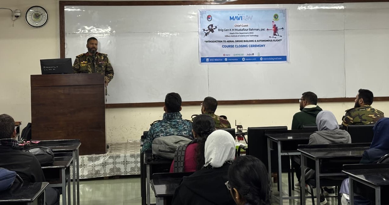 MIST Mavirov, a student-led research team under the supervision of the EECE Department, successfully concluded the "Introduction to Aerial Drone Building and Autonomous Flight” course, with a closing ceremony held today. A total of 63 students from various departments of MIST participated in this 4-day, hands-on and theory-based course, gaining practical experience in aerial drone construction and autonomous flight systems. The course culminated in a field test on the final day, where participants applied their knowledge through real-time flight operations.